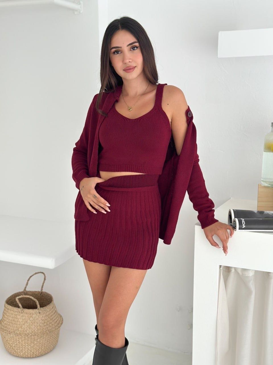 A chic ribbed knit set with a fitted top, mini skirt, and matching cardigan. Comfortable, flattering, and easy to style.