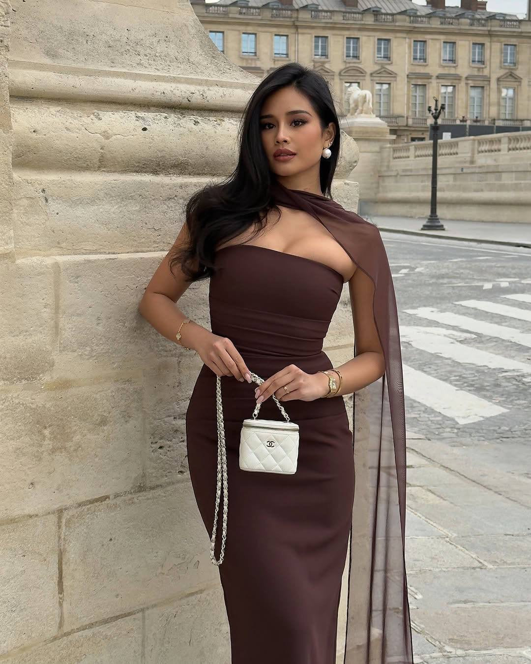 The Hera Dress embodies timeless elegance with a modern edge. Designed in a sleek strapless silhouette, it features a refined neck scarf detail and matching sheer gloves that elevate the look effortlessly. Perfect for evening occasions where sophistication meets confidence.